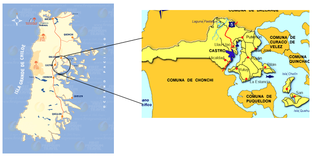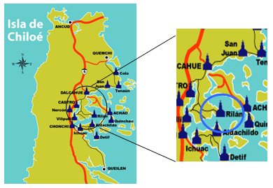 PenÃnsula de RilánLa península de Rilán, pertenece geográficamente a la comuna de Castro, se ubica en relación al centro de la comuna al Noreste, aproximadamente a 10 km. Tiene forma semejante a un triángulo, con su base en el lado sur. Está parcialmente separada del resto de la Isla Grande por el fiordo de Castro y el Canal Dalcahue la separa de la isla Quinchao. Tiene una superficie aproximada de 100 km² y su mayor anchura, unos 18 km, se encuentra entre las puntas de Peuque y Aguantao. En la costa de la península existen varios pequeños poblados como Curahue, Quilquico y Rilán. En el sector que está más cercano a la ciudad de Castro se ubican las playas de Quento, Tongoy y Yutuy, que son usadas como balneario. ![]() Fuente: Prorural, Asociación de Municipios de Chiloé, 2000.